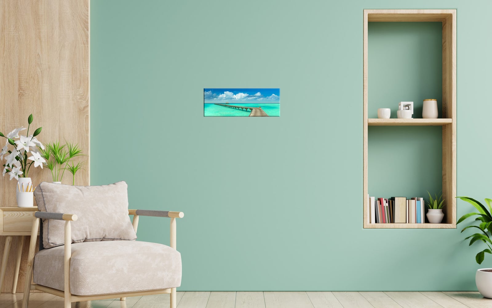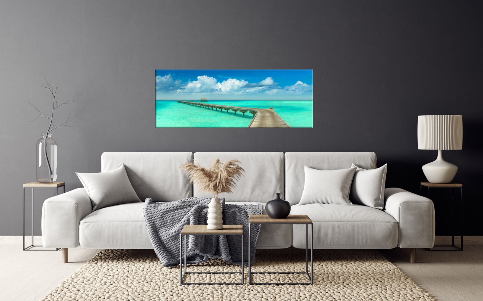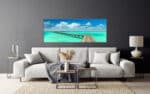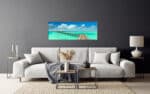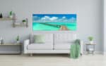 A panoramic art print featuring a pristine tropical beach with clear turquoise waters, lush palm trees, and a sunny blue sky.
