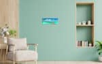 A panoramic artwork depicting a vibrant beach scene with turquoise waters, white sandy beach, waves, and green coastal vegetation.