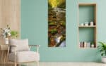 A panoramic photograph of a serene waterfall surrounded by moss-covered rocks and autumn leaves in a forest.