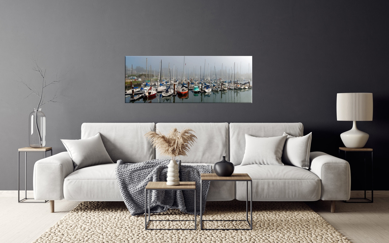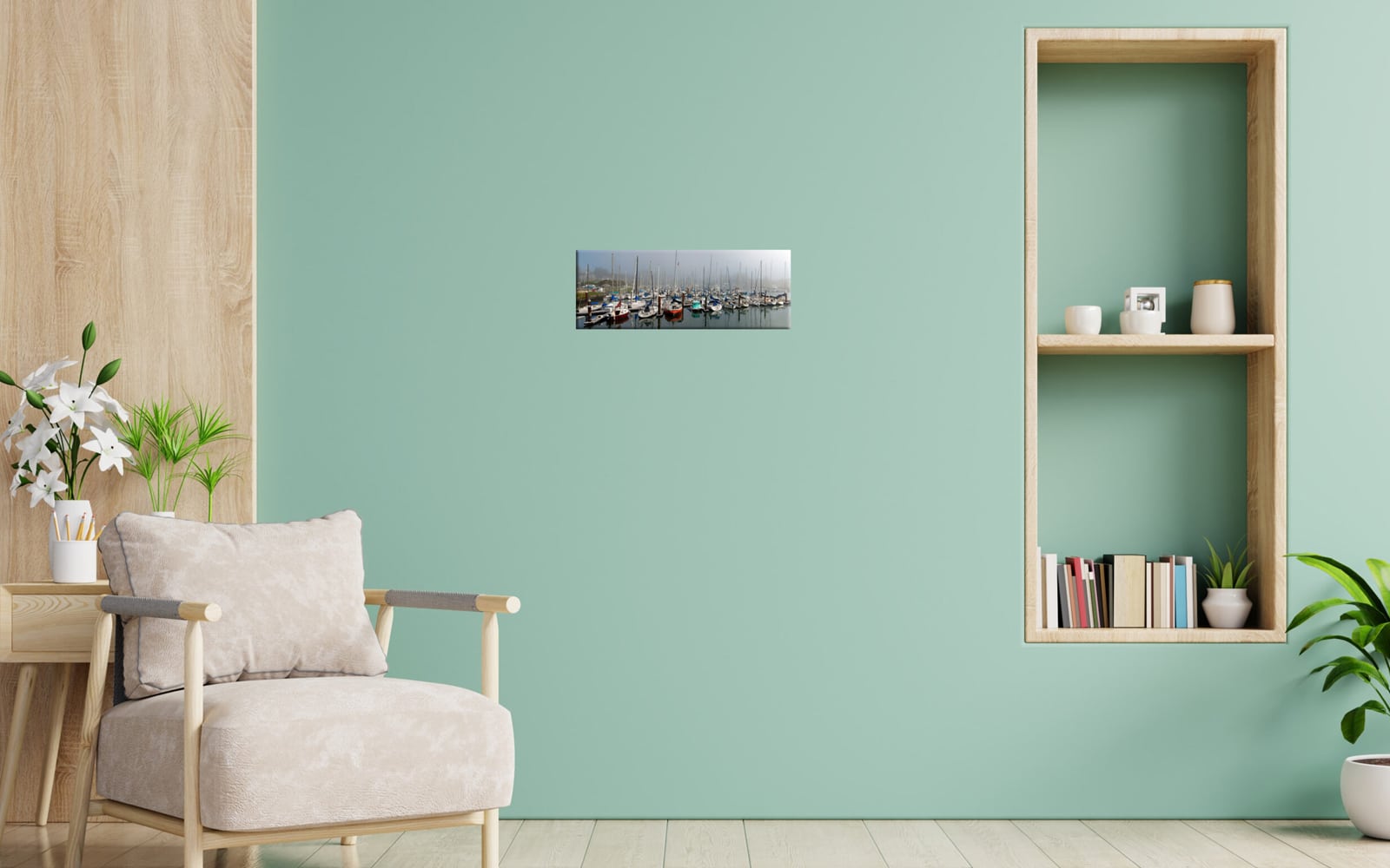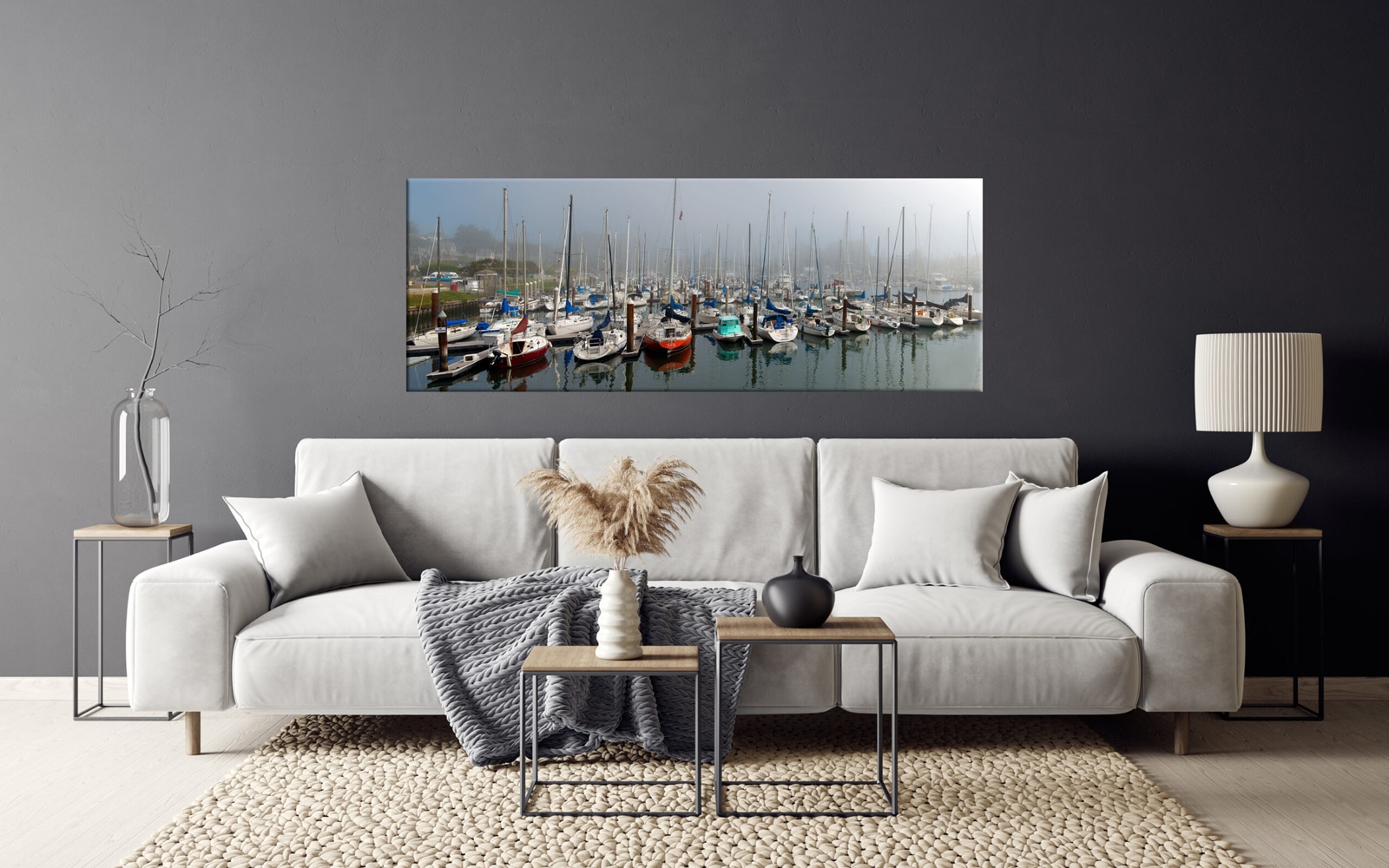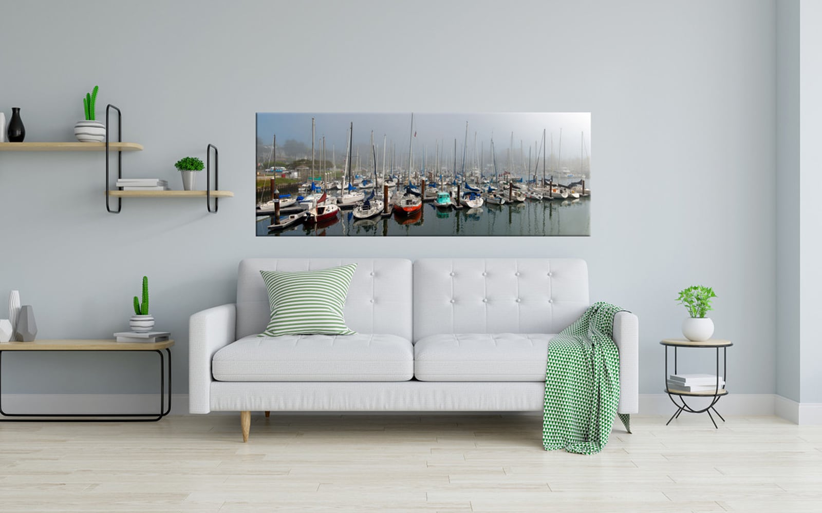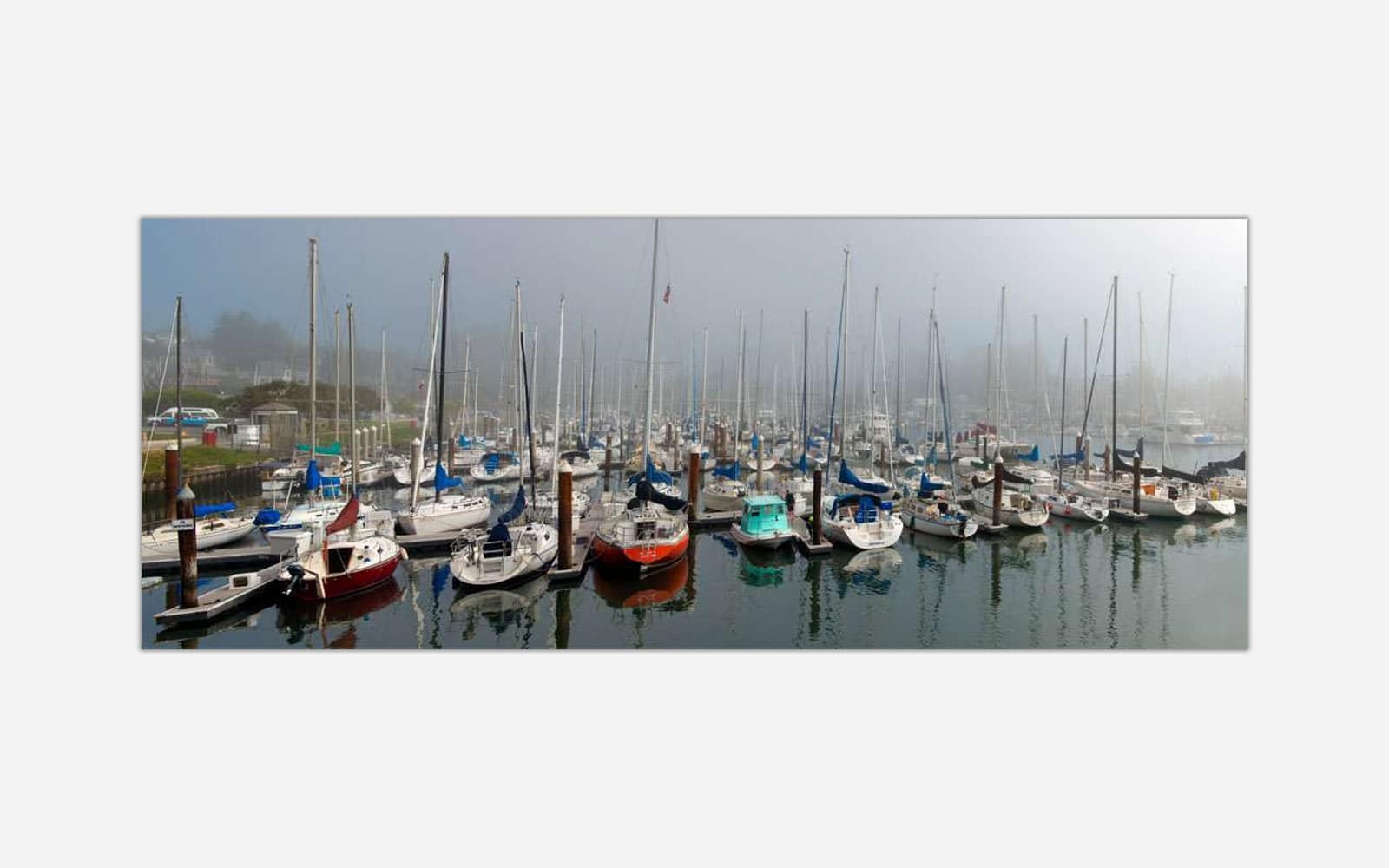 A serene artwork displaying a foggy marina with multiple sailboats docked and their reflections in the calm water.