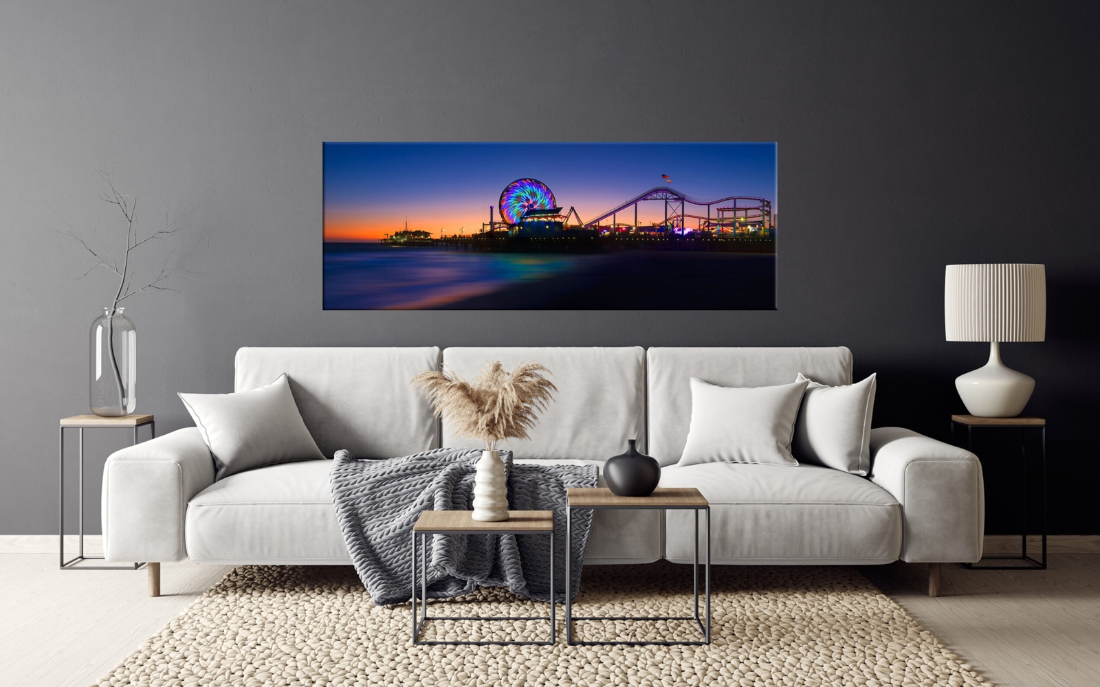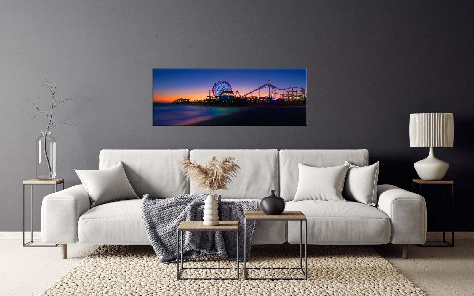 A photograph of a beach pier amusement park at sunset with a colorful Ferris wheel and roller coaster silhouettes against a twilight sky.