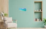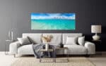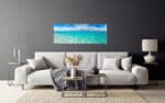 A panoramic art print featuring a pristine tropical beach with clear turquoise waters, lush palm trees, and a sunny blue sky.