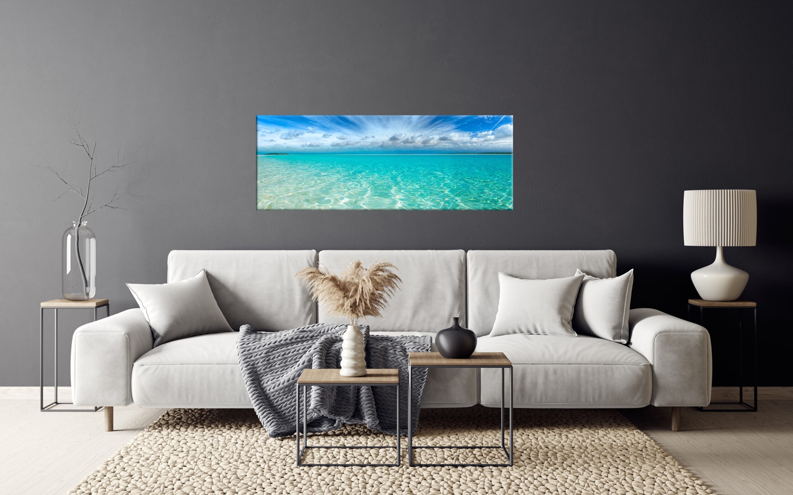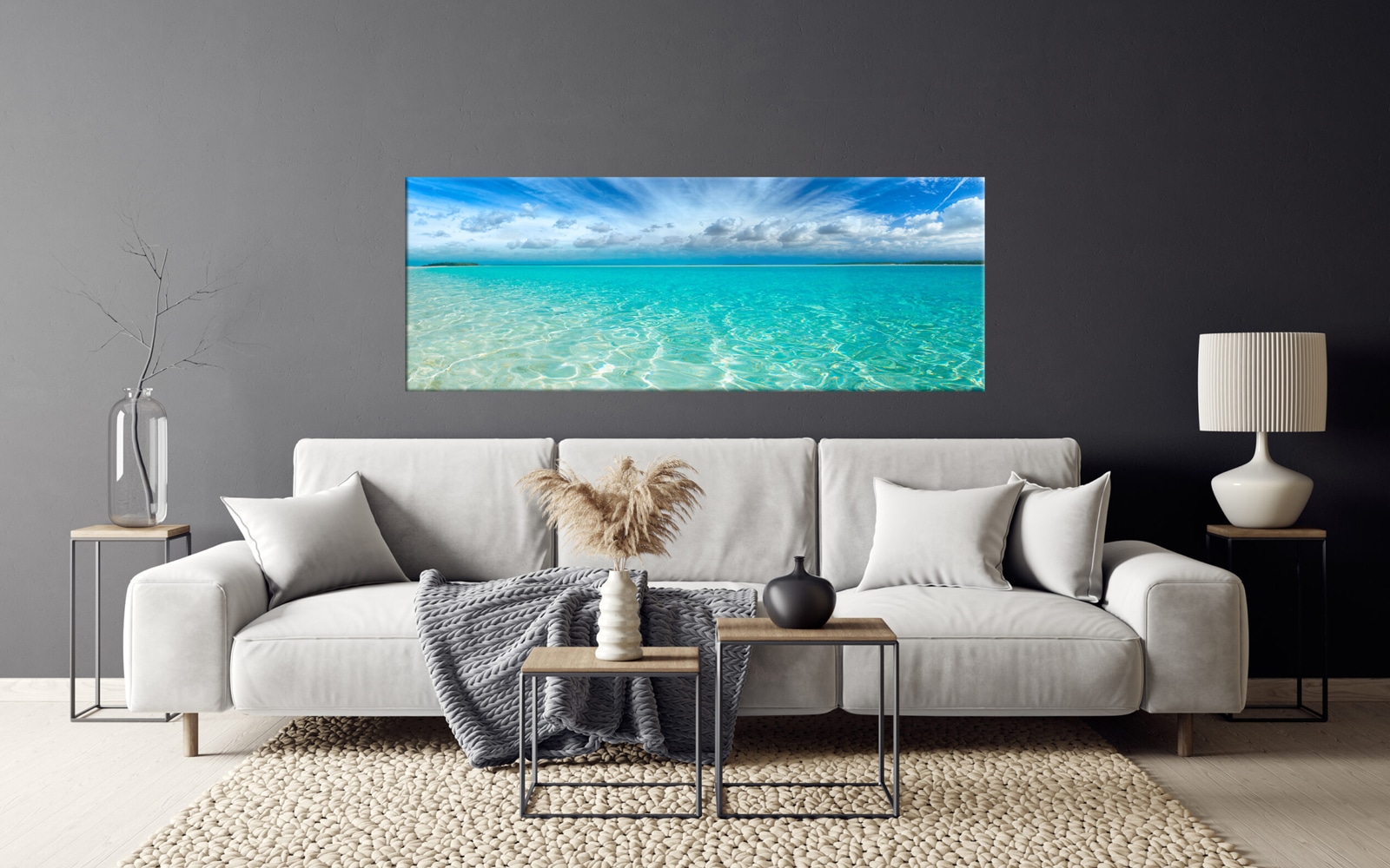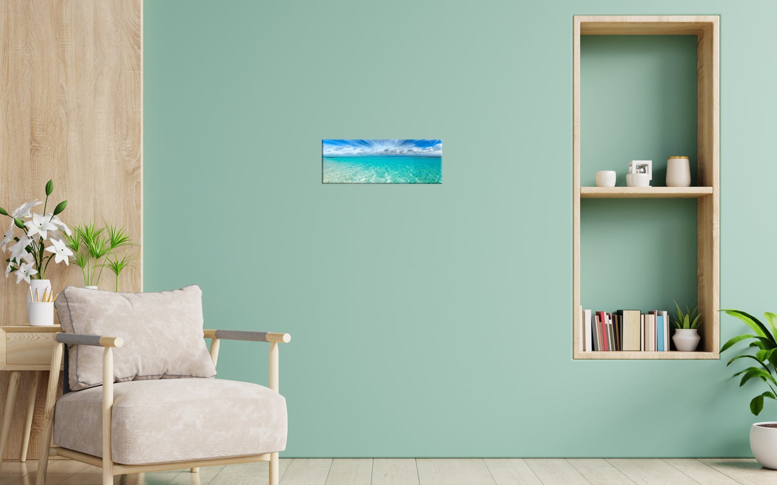 A canvas print featuring a serene tropical beach scene with clear turquoise water and a blue sky with scattered clouds.