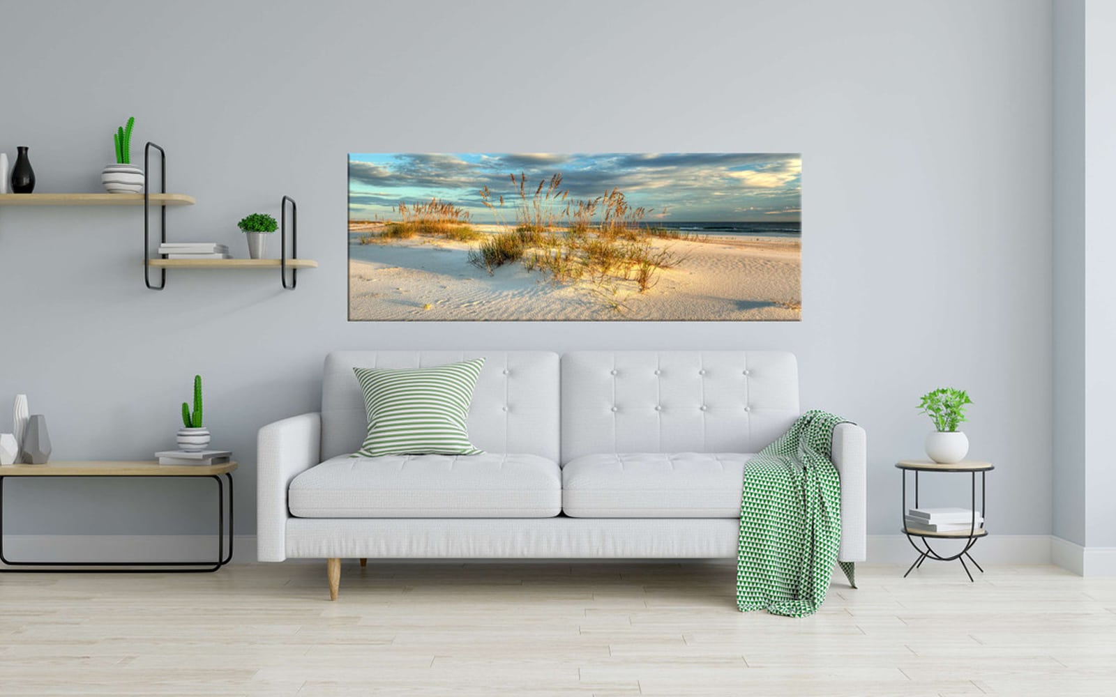 A panoramic artwork of a serene beach scene with sand dunes, beach grass, a calm sea in the distance, and a cloudy sky in warm tones.