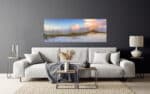 A panoramic art print of a serene lake scene at sunset, featuring a wooden boat dock with a small boat, calm water reflecting the colorful sky, and a quaint boat house at the end of the pier.