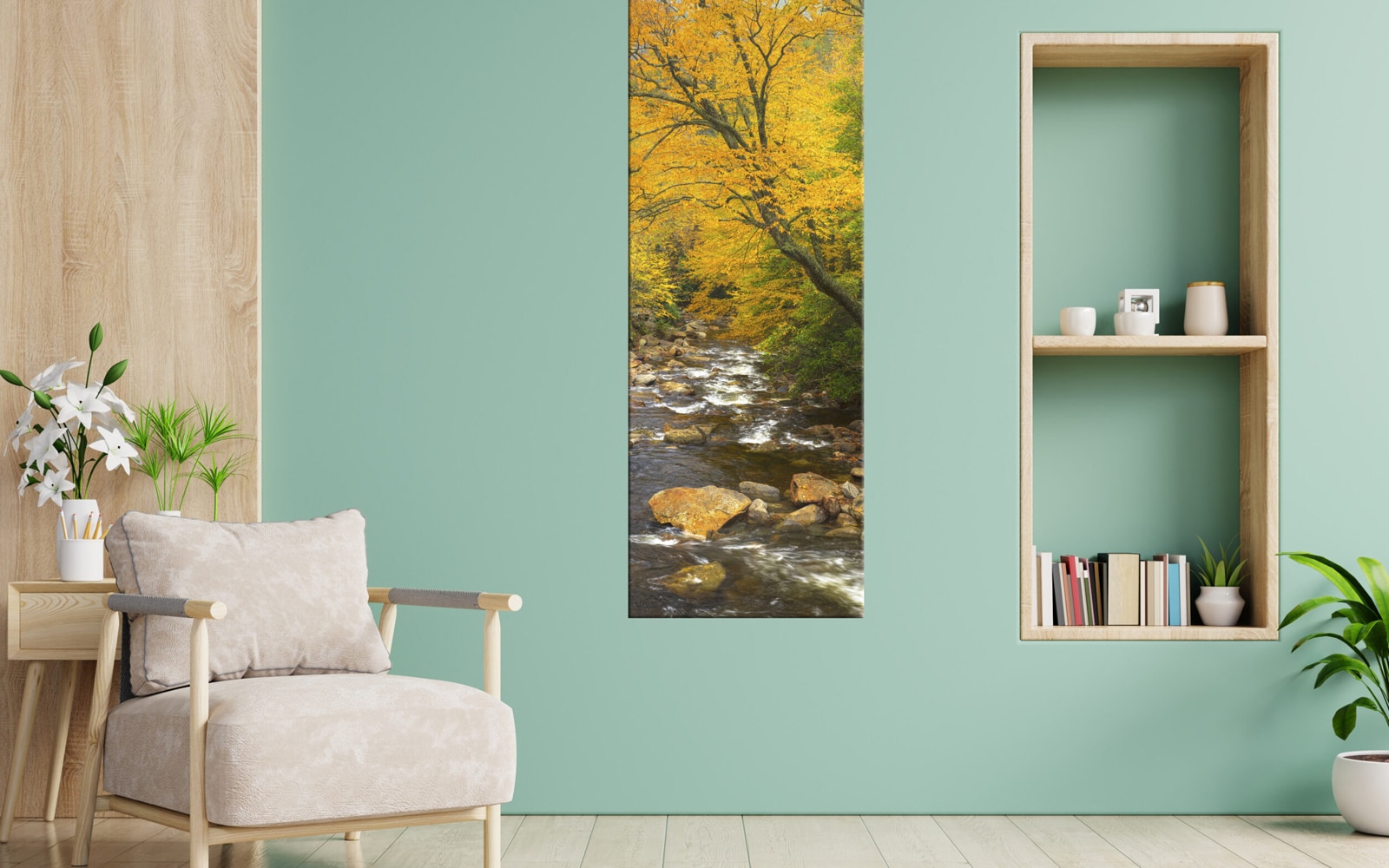 A photographic print depicting a serene autumn landscape with a flowing stream surrounded by colorful trees and scattered rocks.