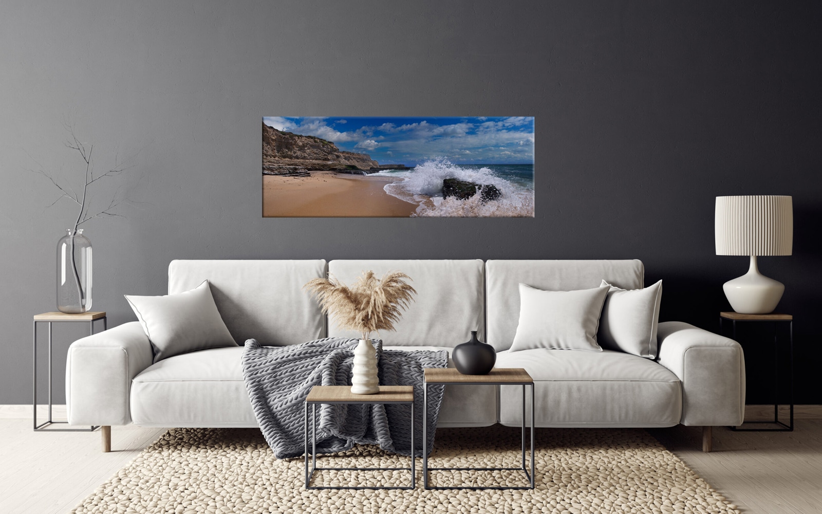 Image shows a dynamic beach scene with a wave crashing against a rock on the sandy shore with a clear blue sky and coastal cliffs in the background.