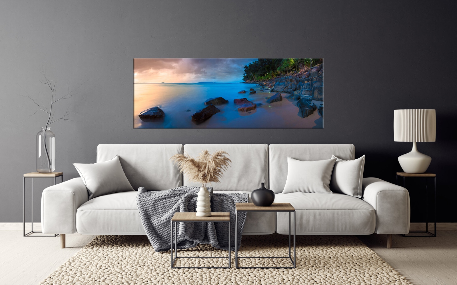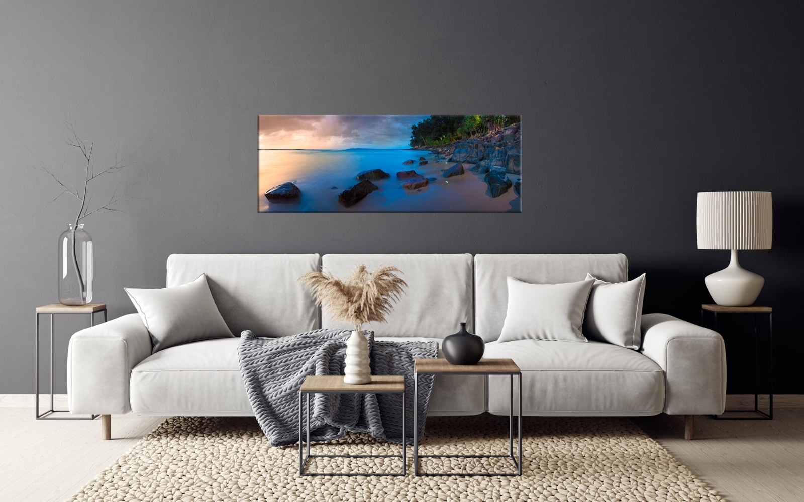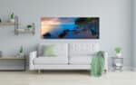 A panoramic canvas print depicting a vibrant turquoise sea with boulders, sailing yachts in the distance, and a clear blue sky.