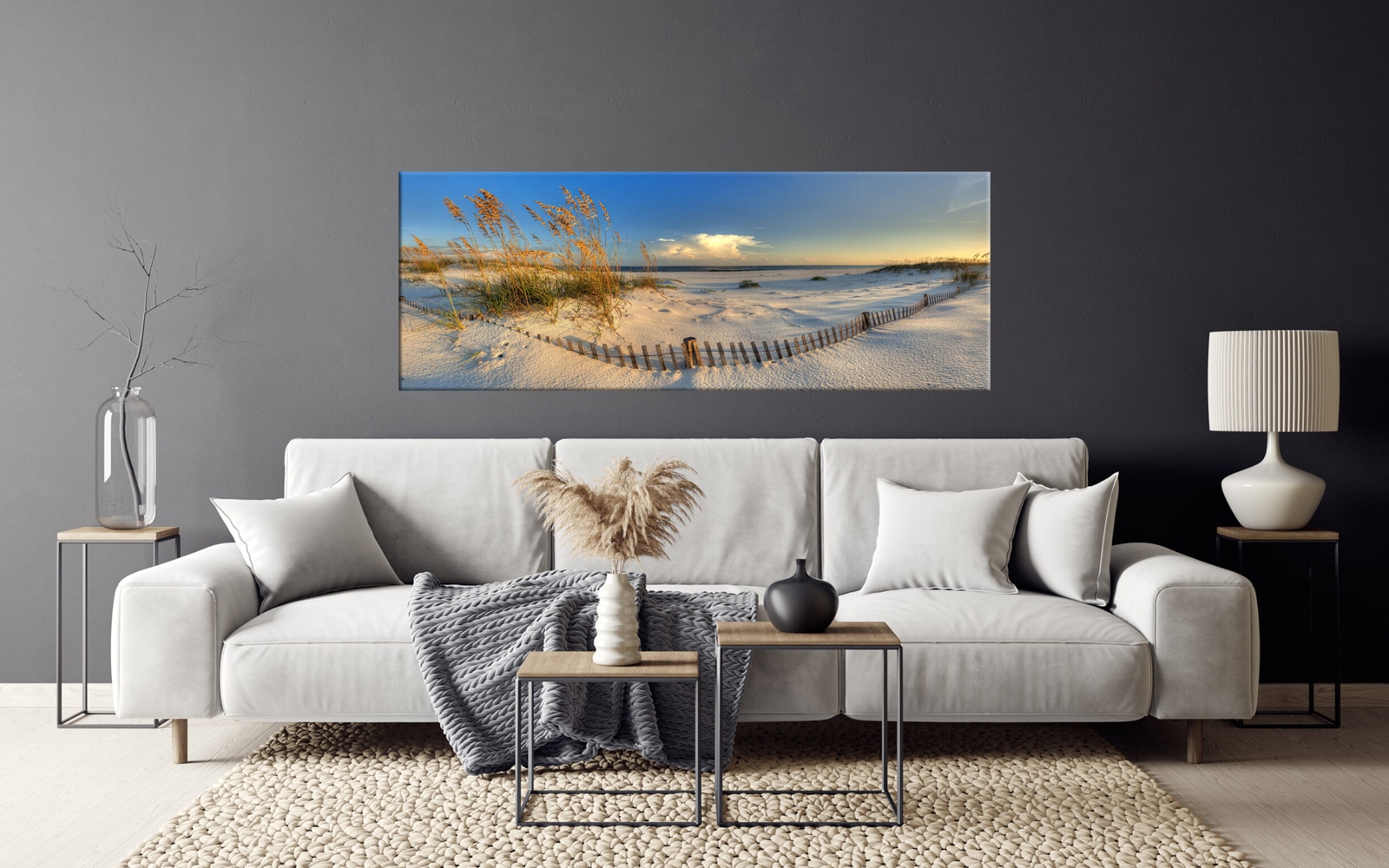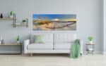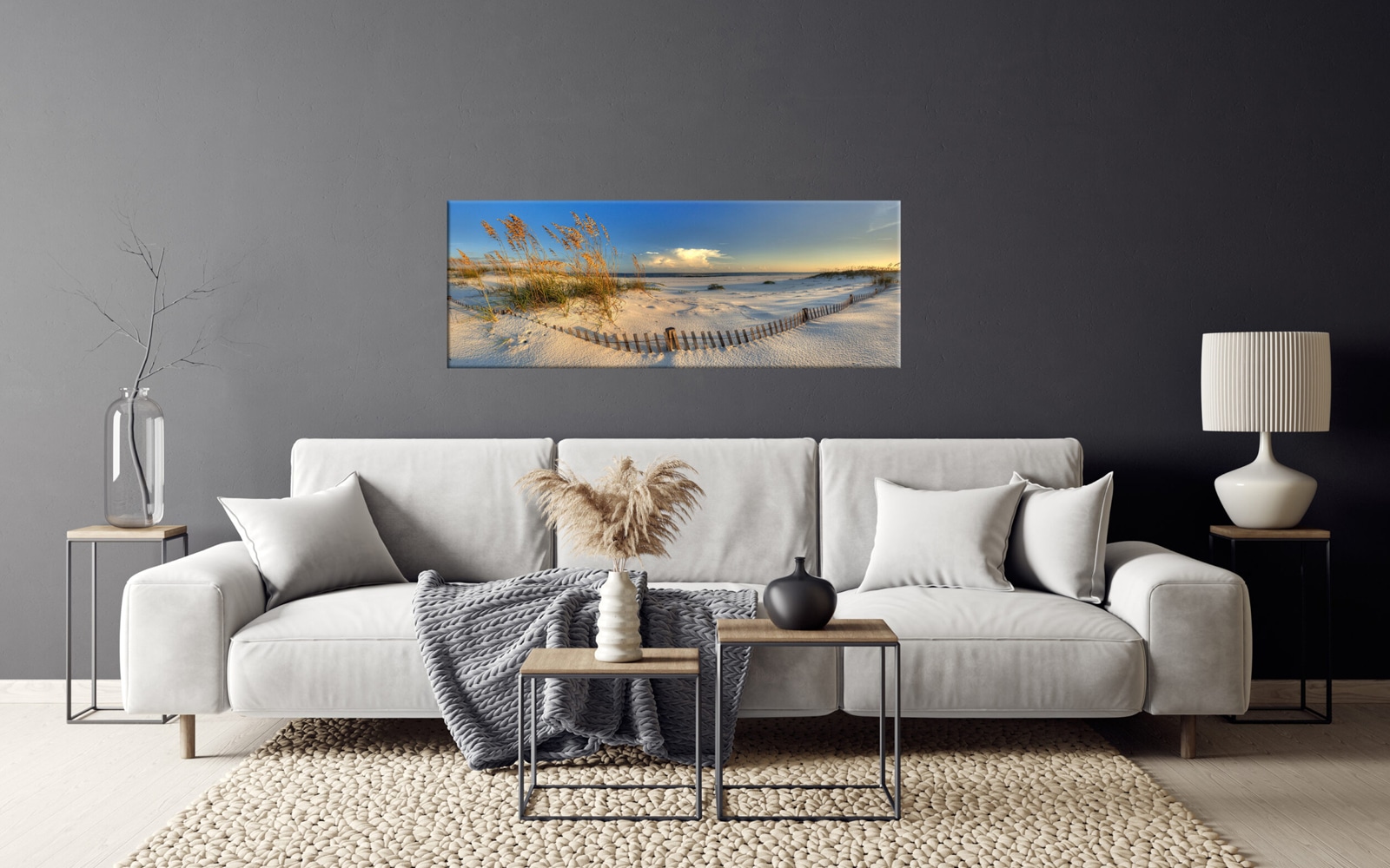A panoramic wall art piece featuring a serene beach at sunset with ocean waves, fluffy clouds, and beach grass in the sand dunes.
