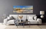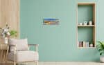 A panoramic canvas print of a tranquil tropical beach with vivid turquoise sea, white sand, and a clear blue sky with fluffy clouds.