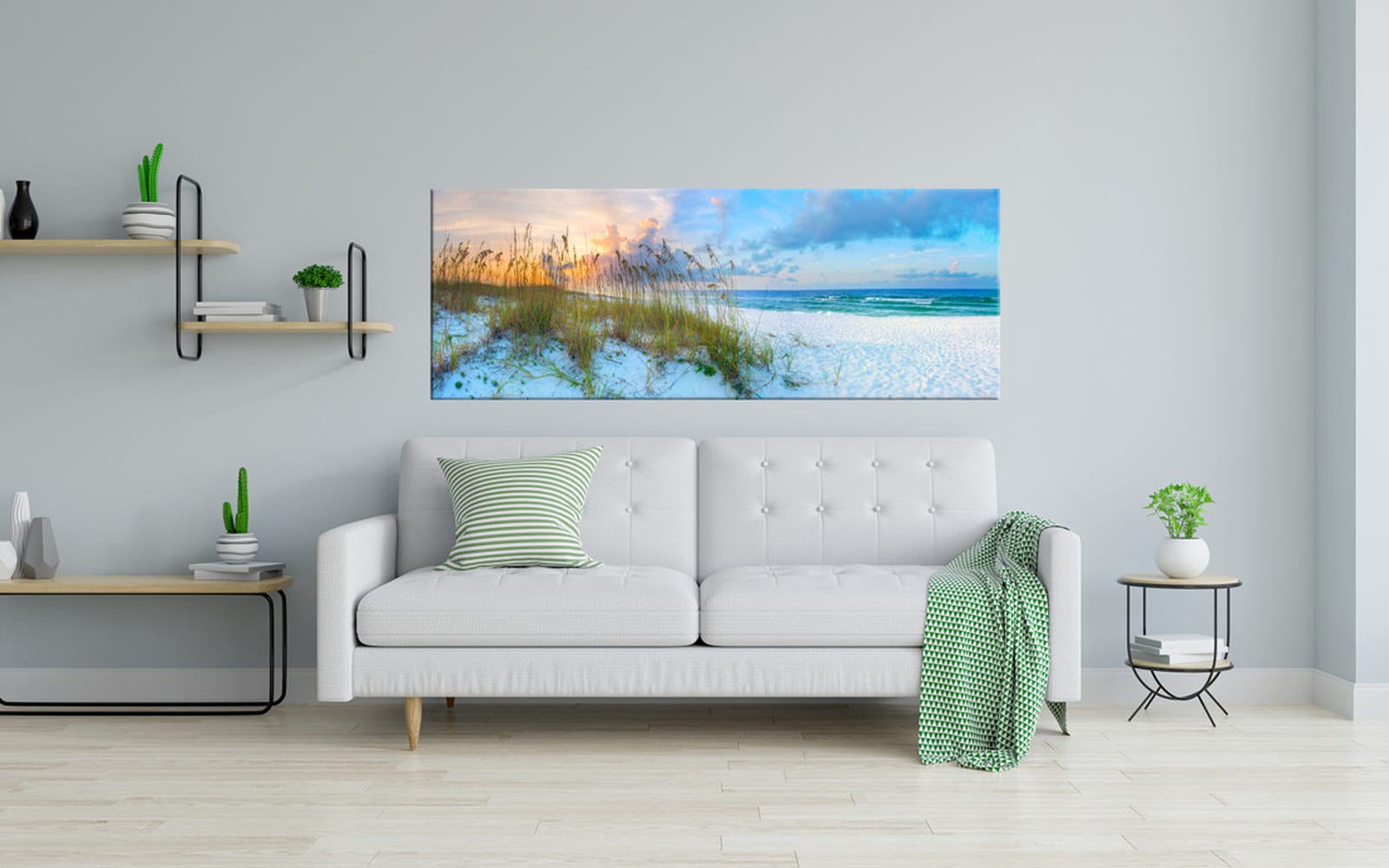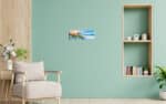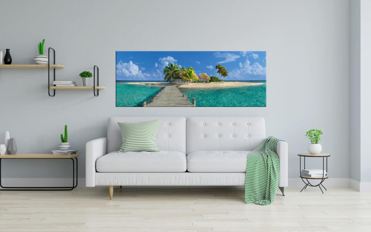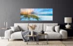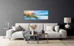 A panoramic canvas print of a tranquil tropical beach with vivid turquoise sea, white sand, and a clear blue sky with fluffy clouds.