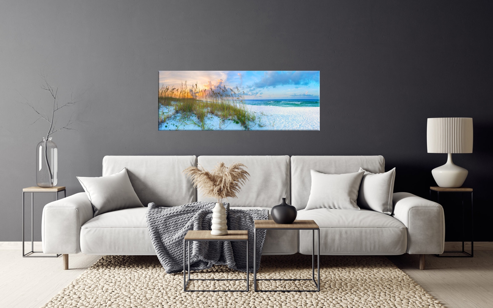 A panoramic wall art piece featuring a serene beach at sunset with ocean waves, fluffy clouds, and beach grass in the sand dunes.