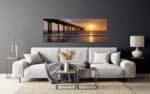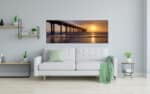 A photograph of a pier extending over the ocean with a stunning sunset in the background, casting warm golden light across the scene.
