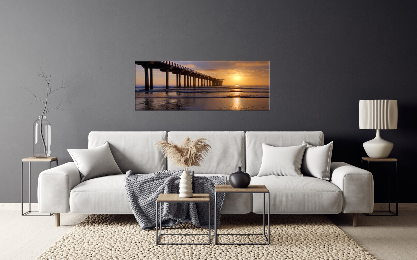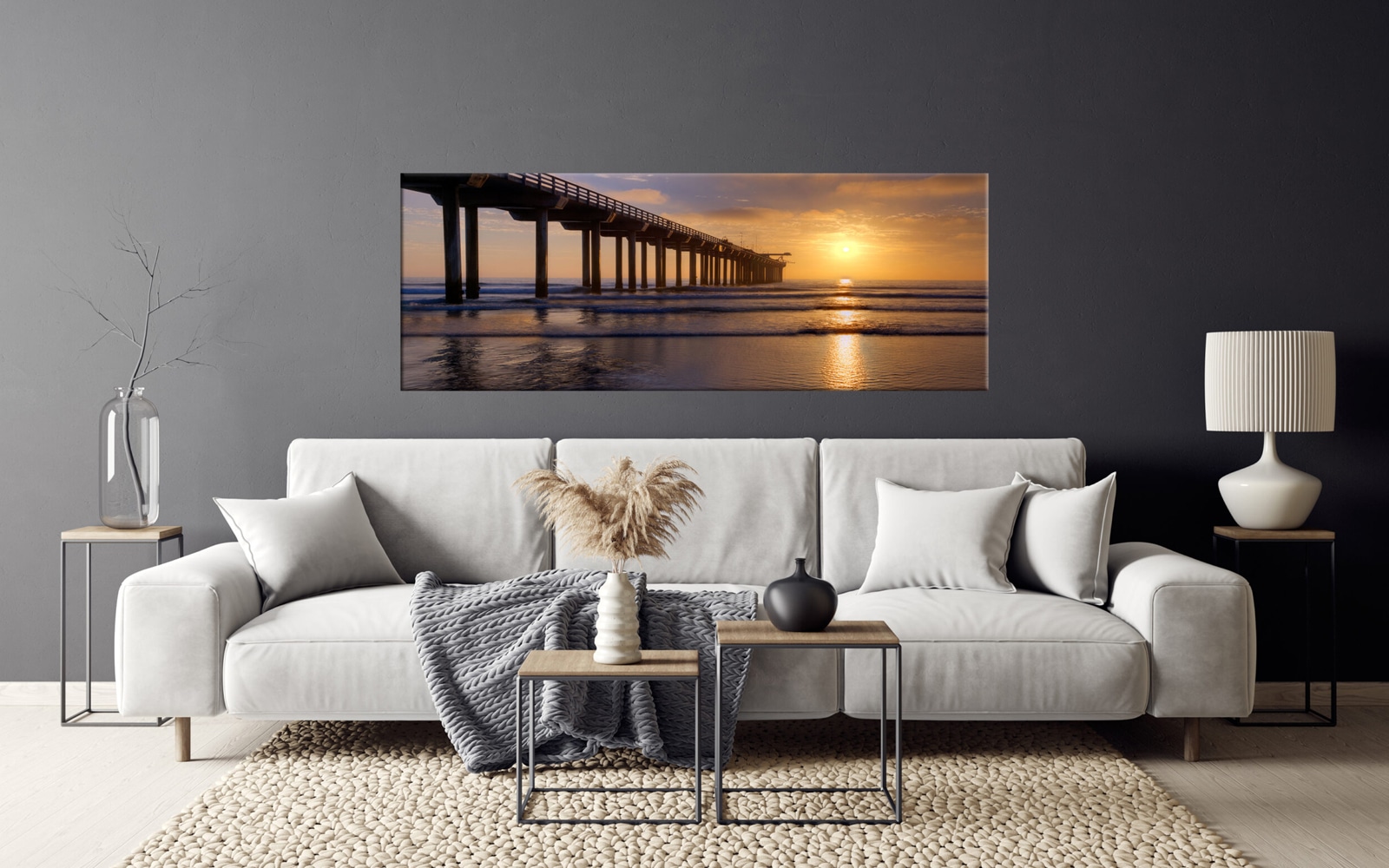 A panoramic art print of a serene lake scene at sunset, featuring a wooden boat dock with a small boat, calm water reflecting the colorful sky, and a quaint boat house at the end of the pier.