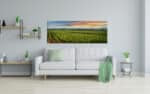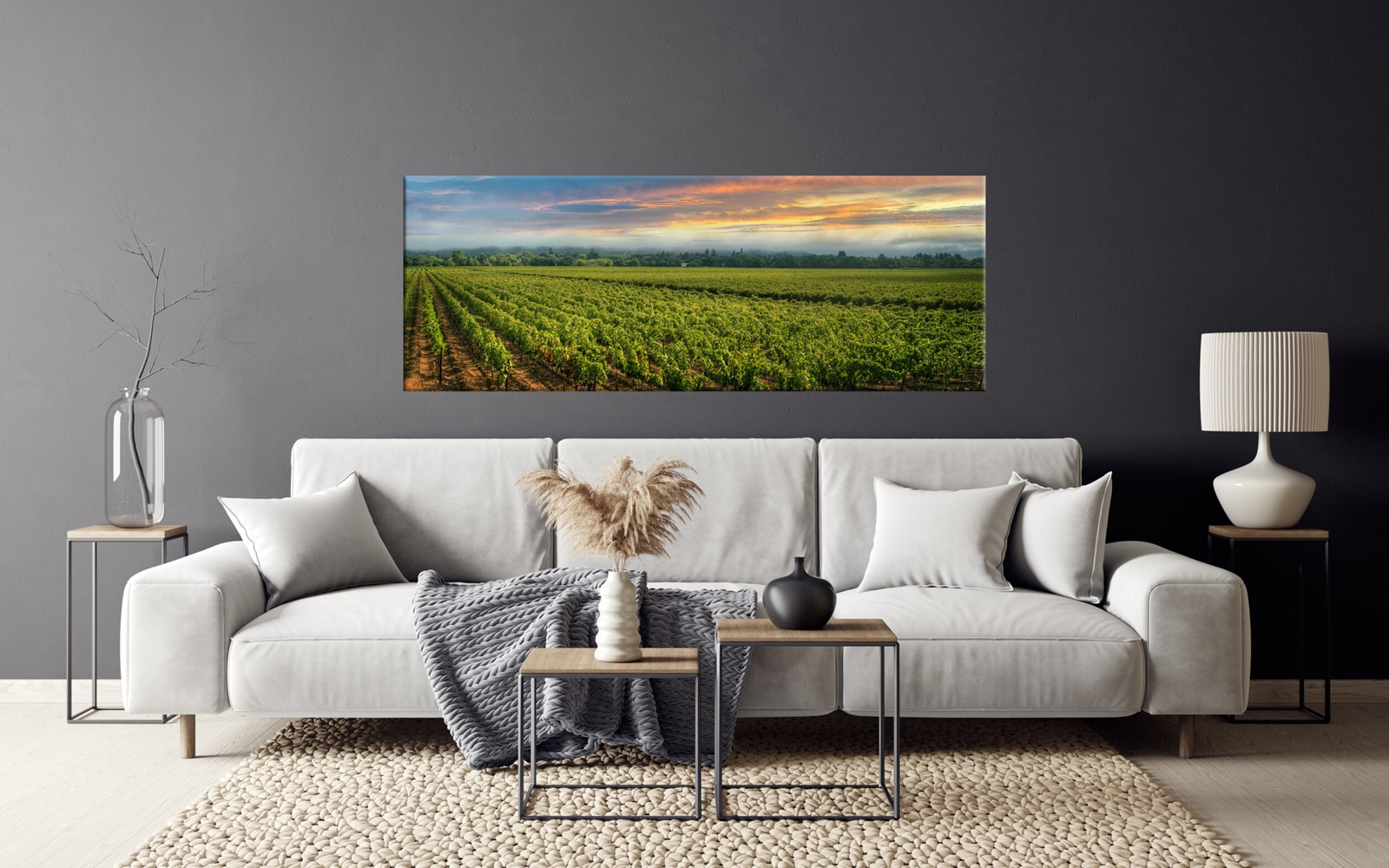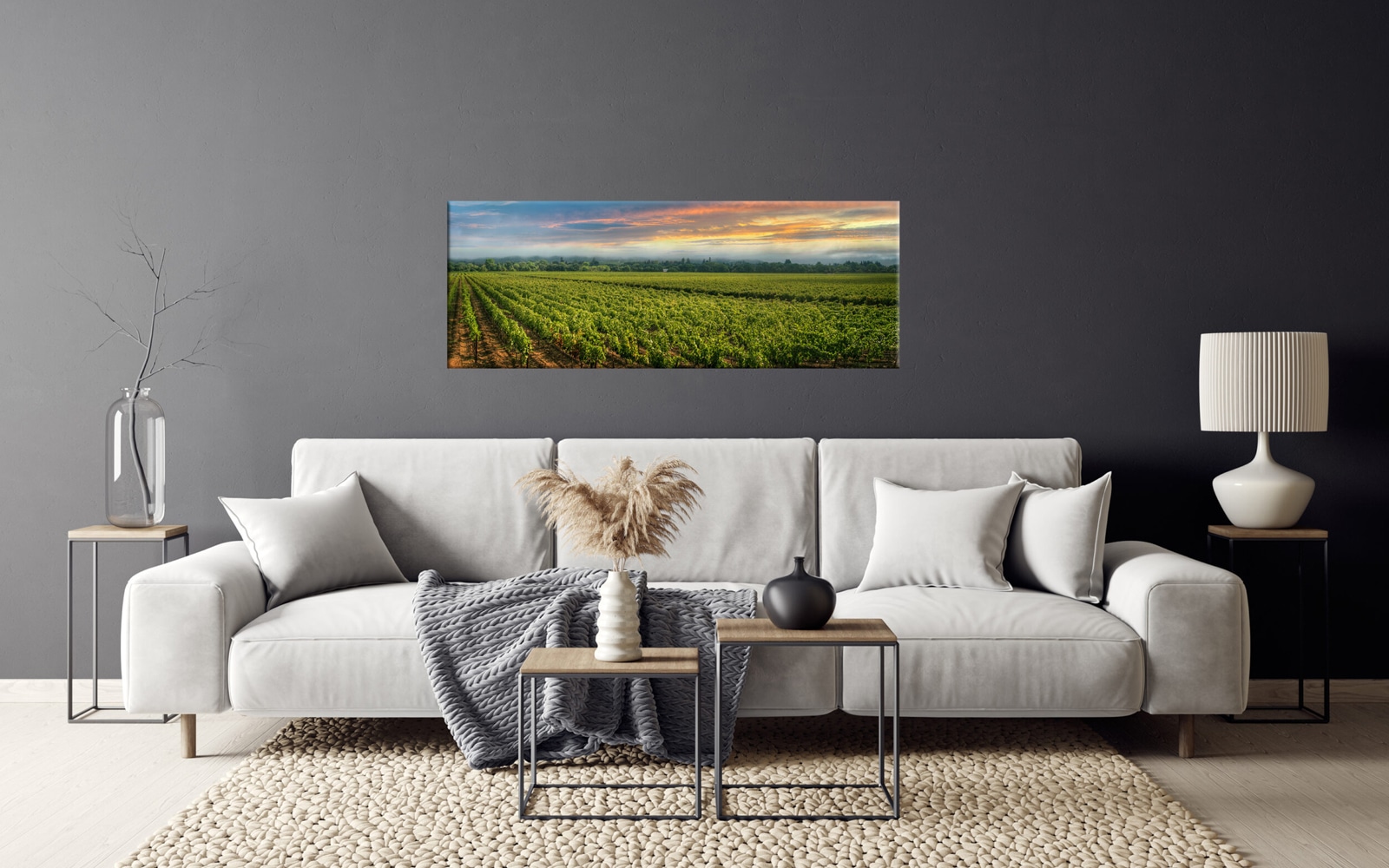 A panoramic view of a vineyard at sunset with colorful skies and lush green grapevines.