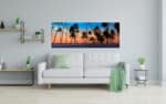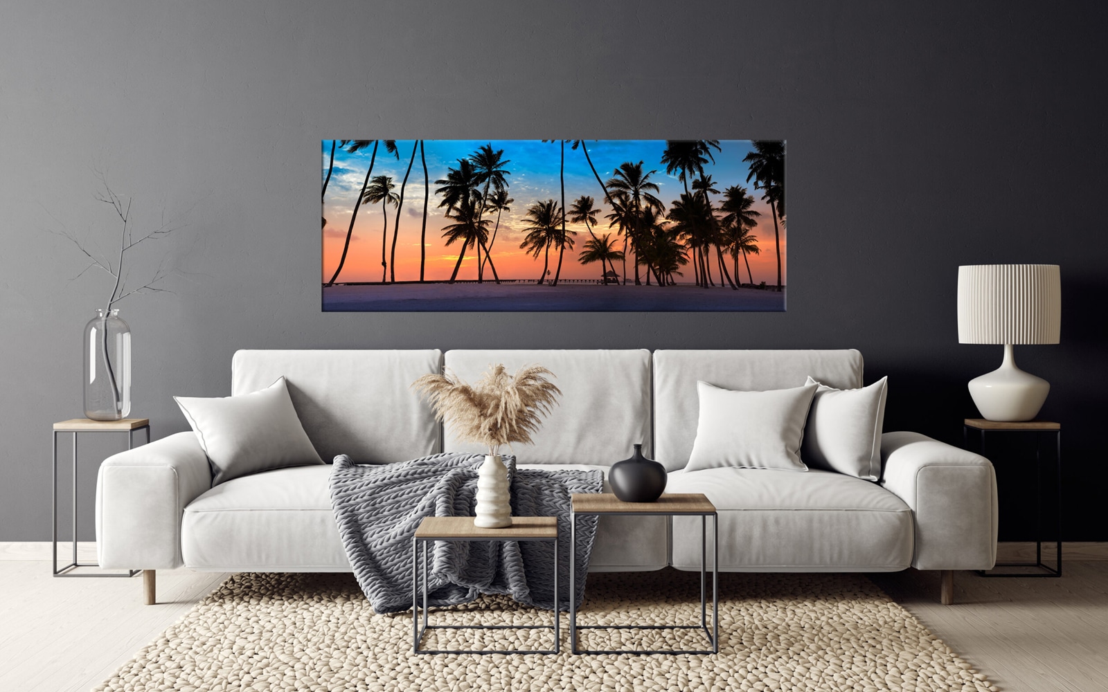 A panoramic art print featuring a pristine tropical beach with clear turquoise waters, lush palm trees, and a sunny blue sky.