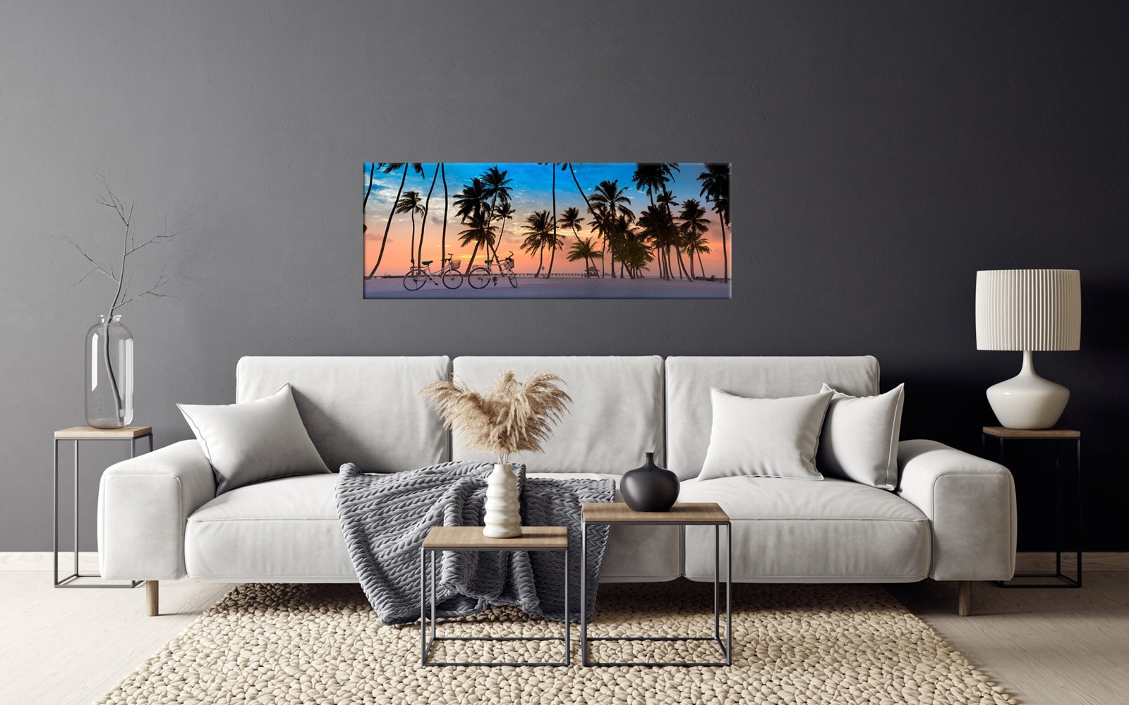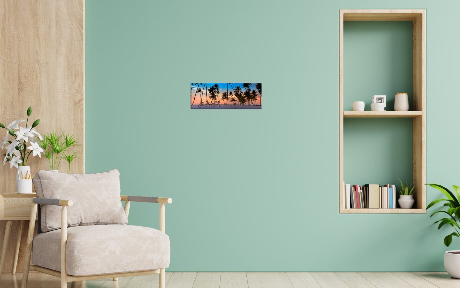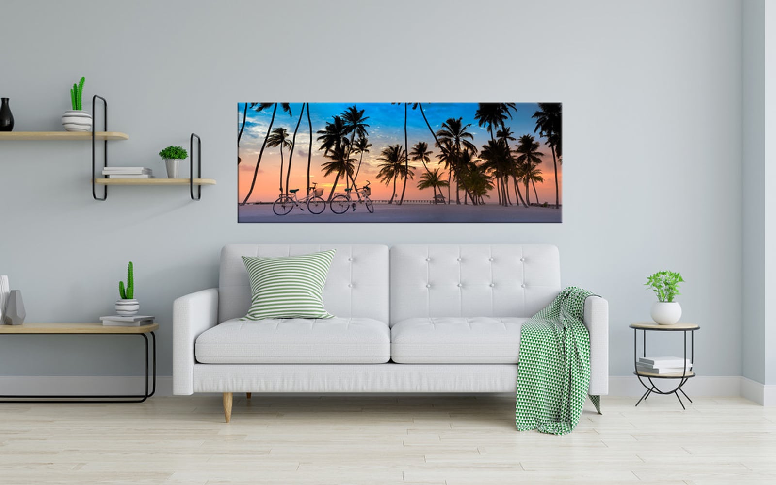 A panoramic art print featuring a pristine tropical beach with clear turquoise waters, lush palm trees, and a sunny blue sky.