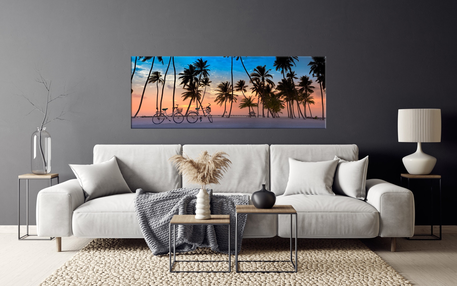 An art print of a serene beach sunset with silhouettes of palm trees and bicycles on white sand, under a pastel-colored sky.