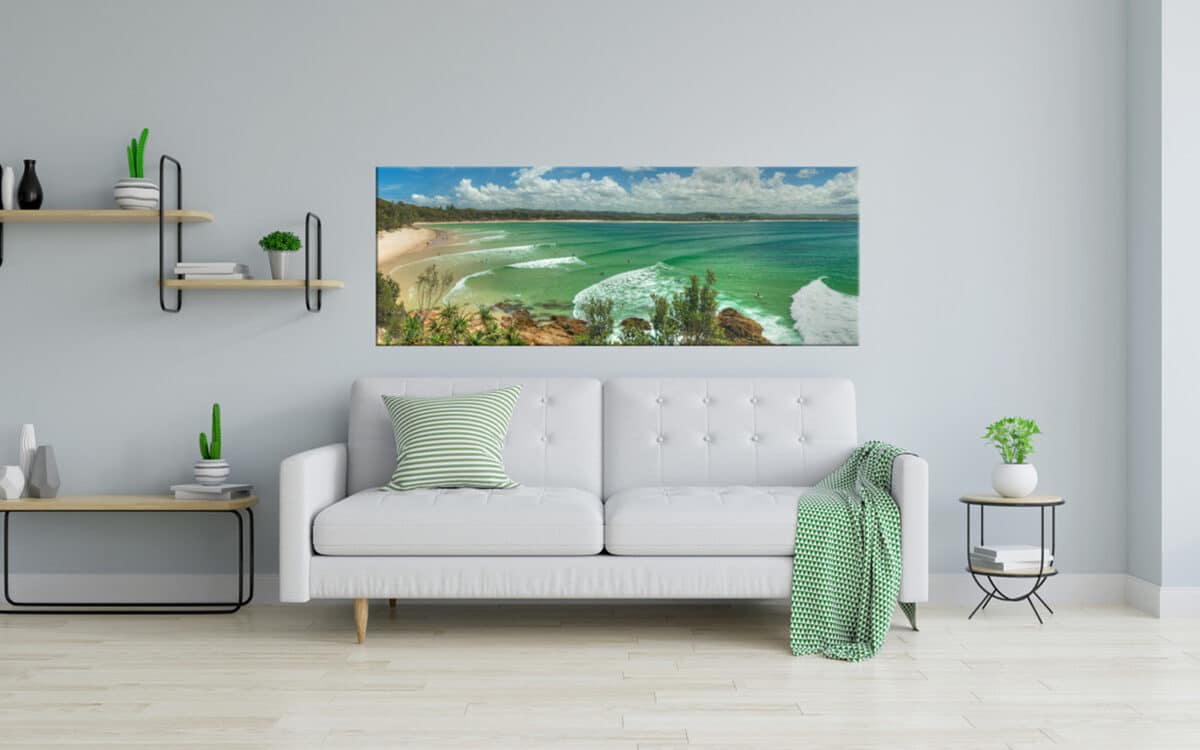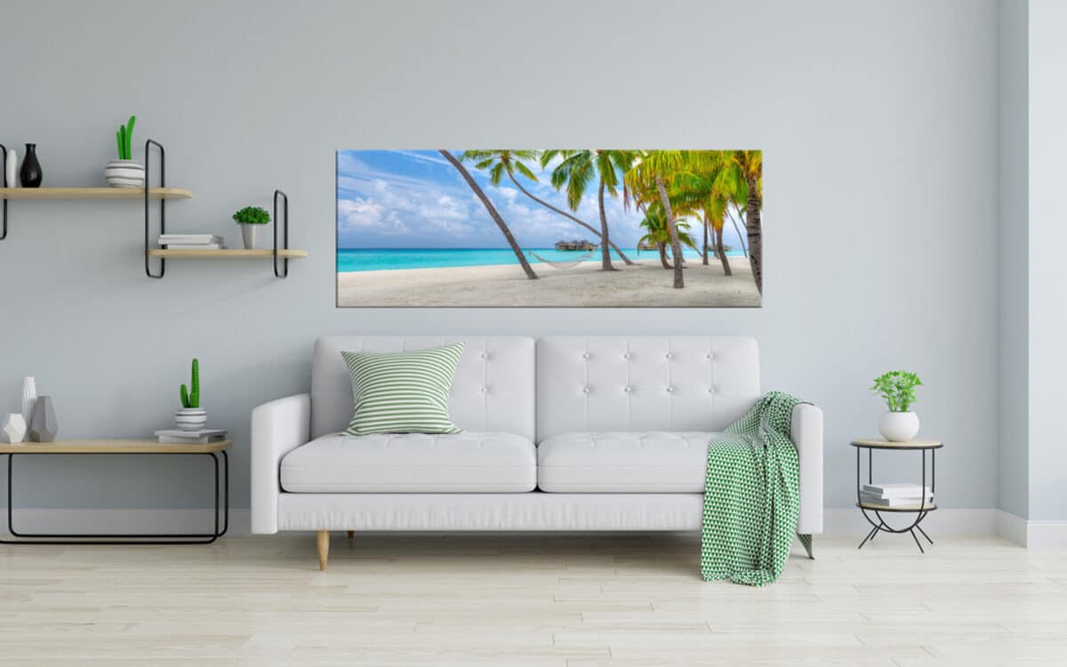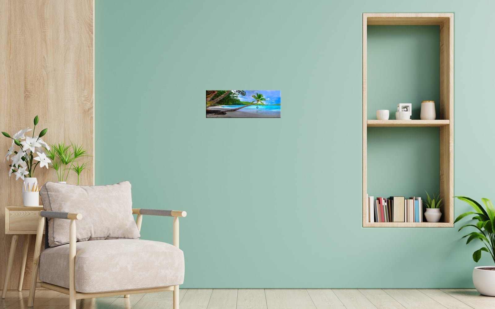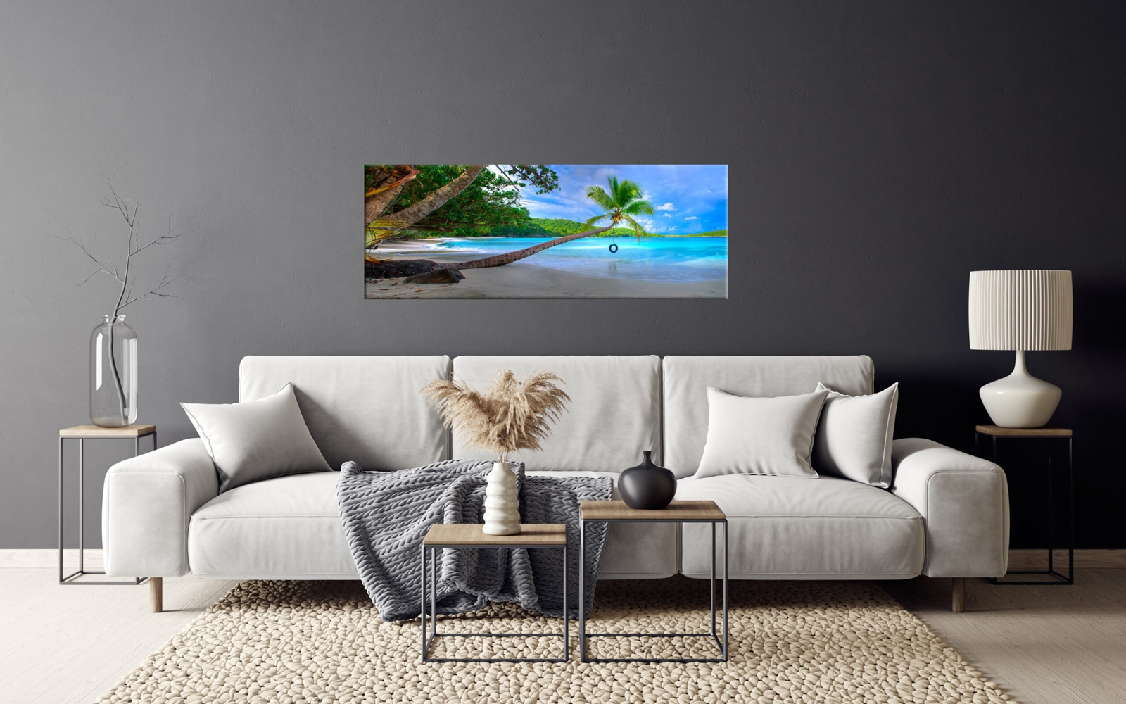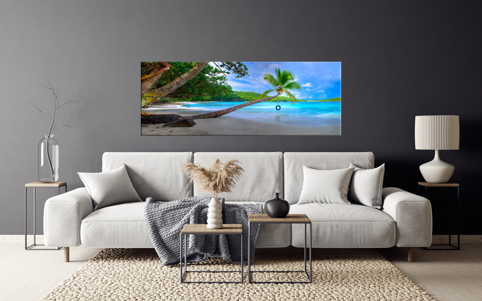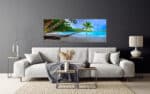 A panoramic canvas print of a tranquil tropical beach with vivid turquoise sea, white sand, and a clear blue sky with fluffy clouds.