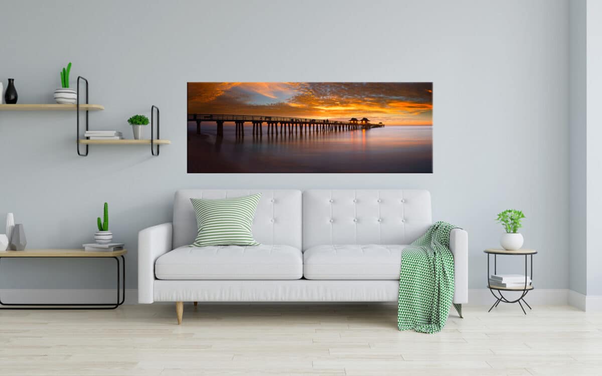 A panoramic art print of a serene lake scene at sunset, featuring a wooden boat dock with a small boat, calm water reflecting the colorful sky, and a quaint boat house at the end of the pier.
