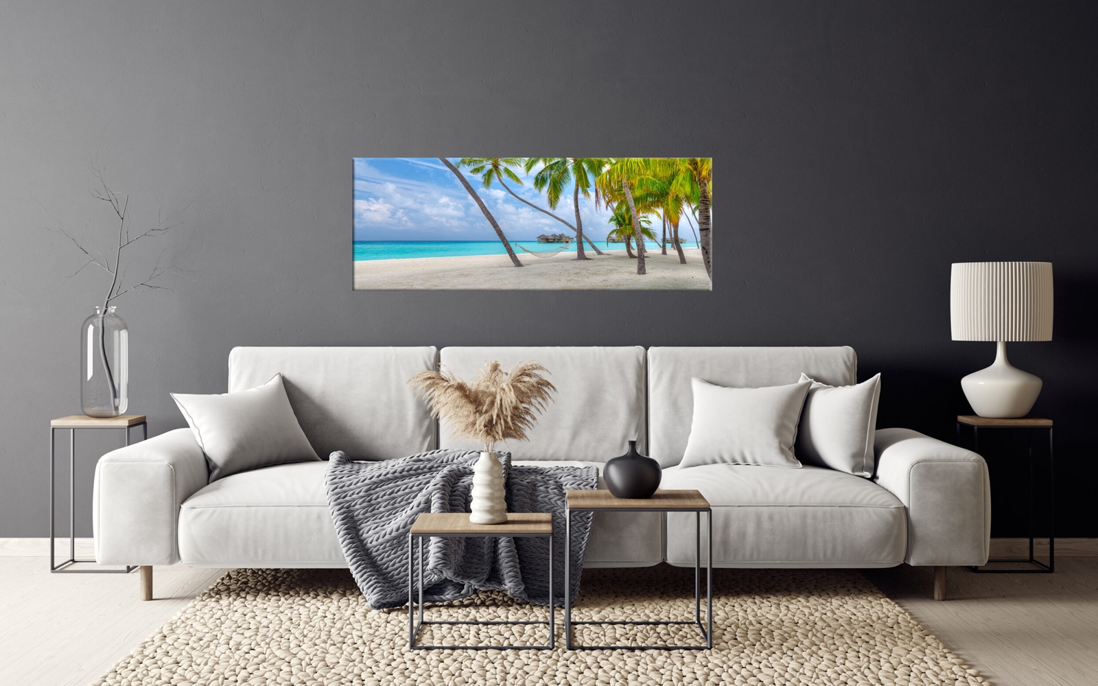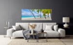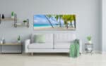 A panoramic art print featuring a pristine tropical beach with clear turquoise waters, lush palm trees, and a sunny blue sky.