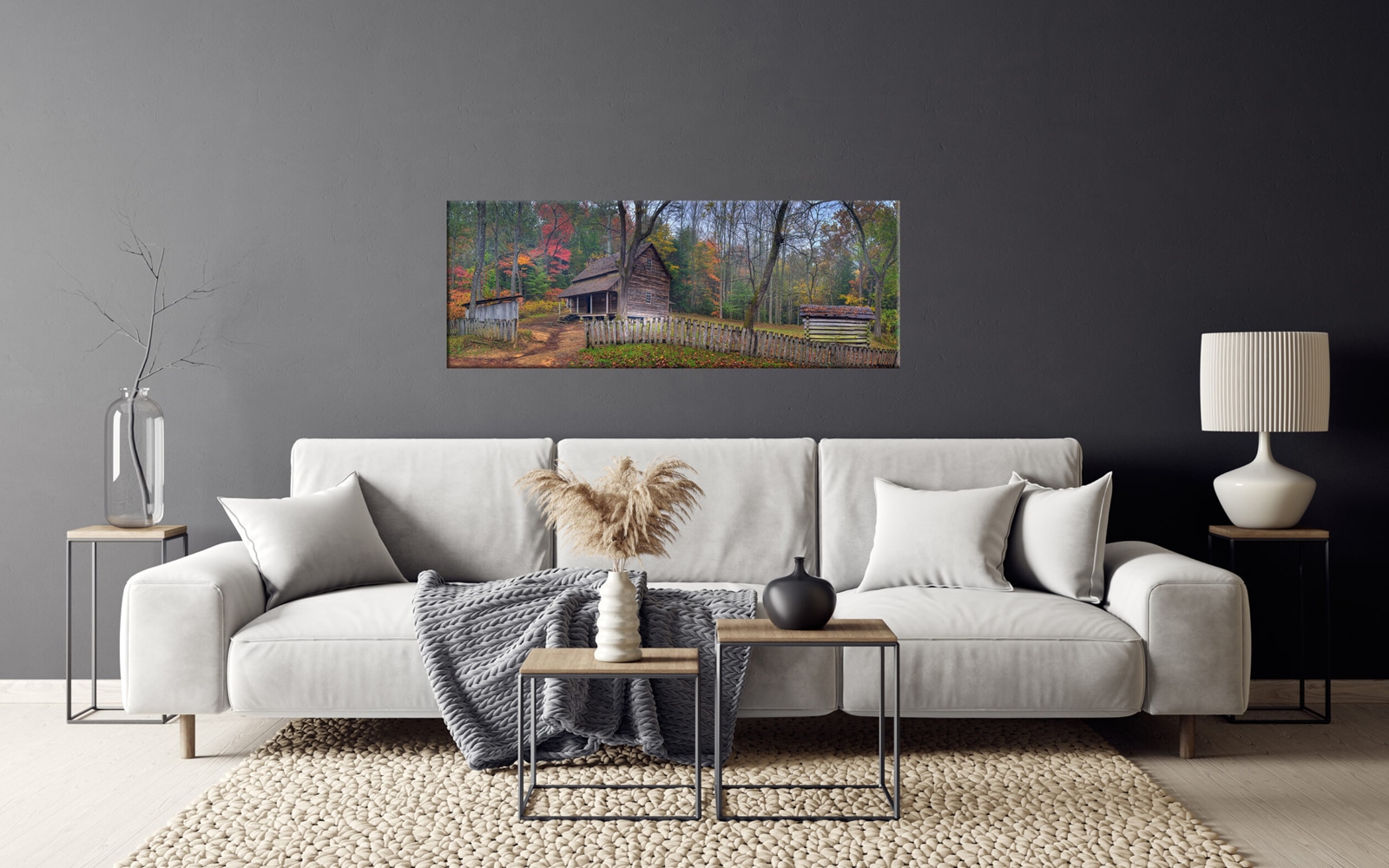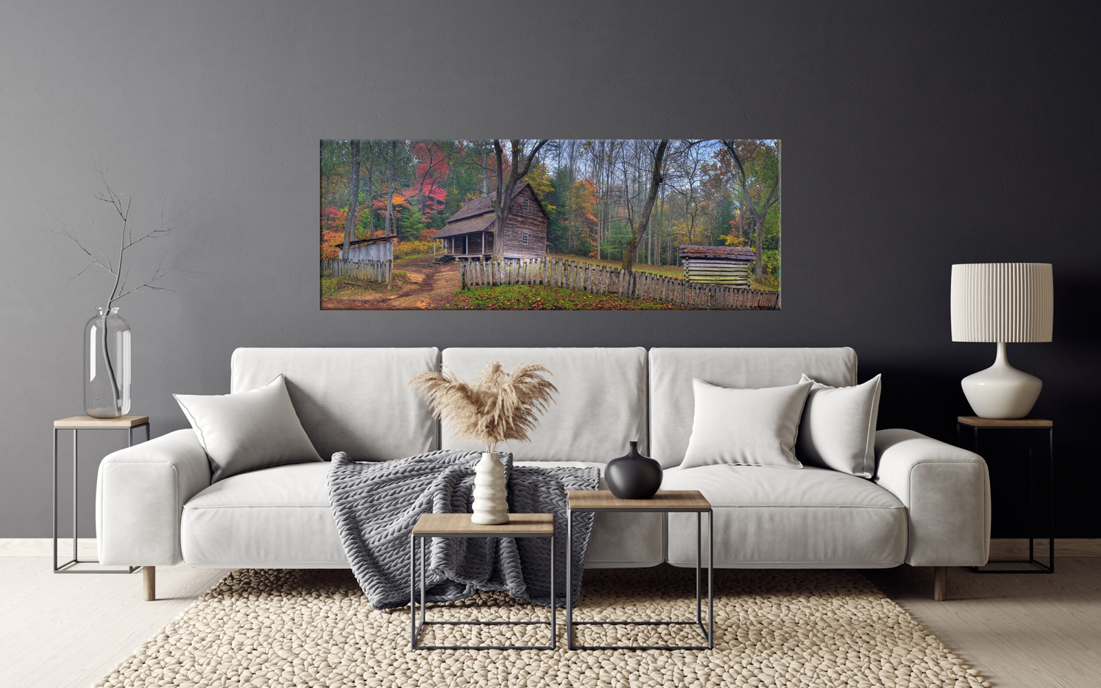A panoramic photograph of a rustic cabin amidst a colorful autumn forest with misty mountains in the background.