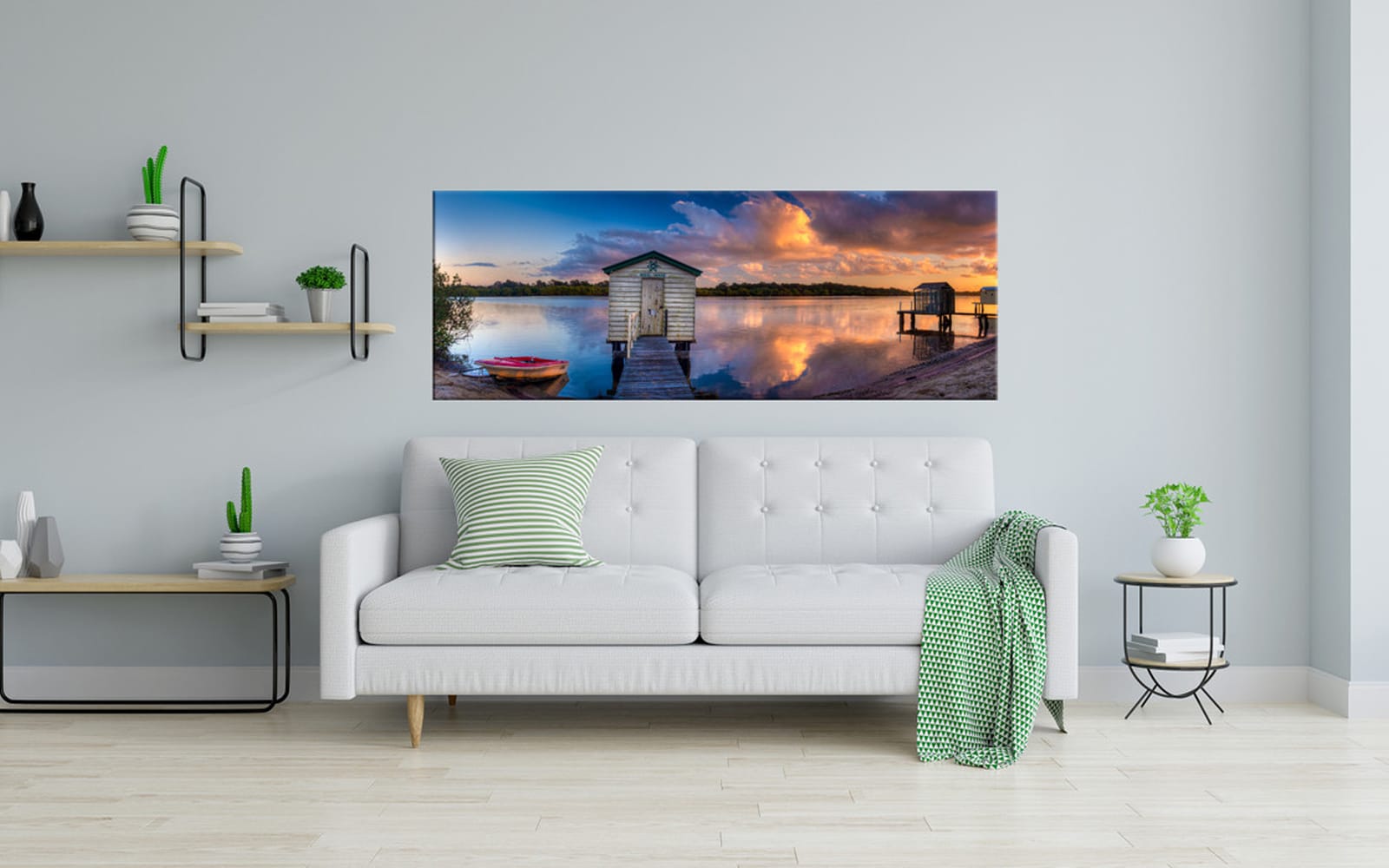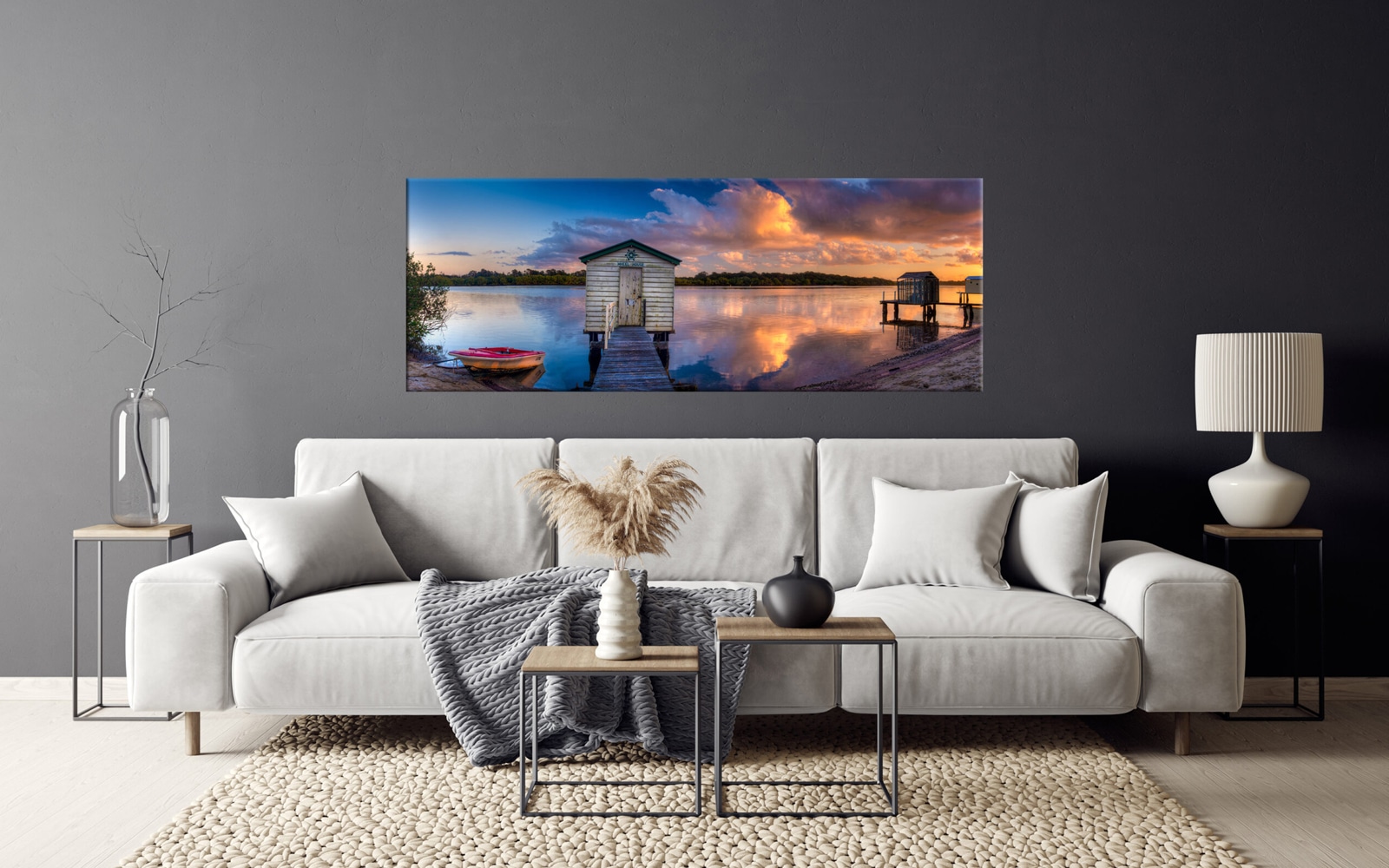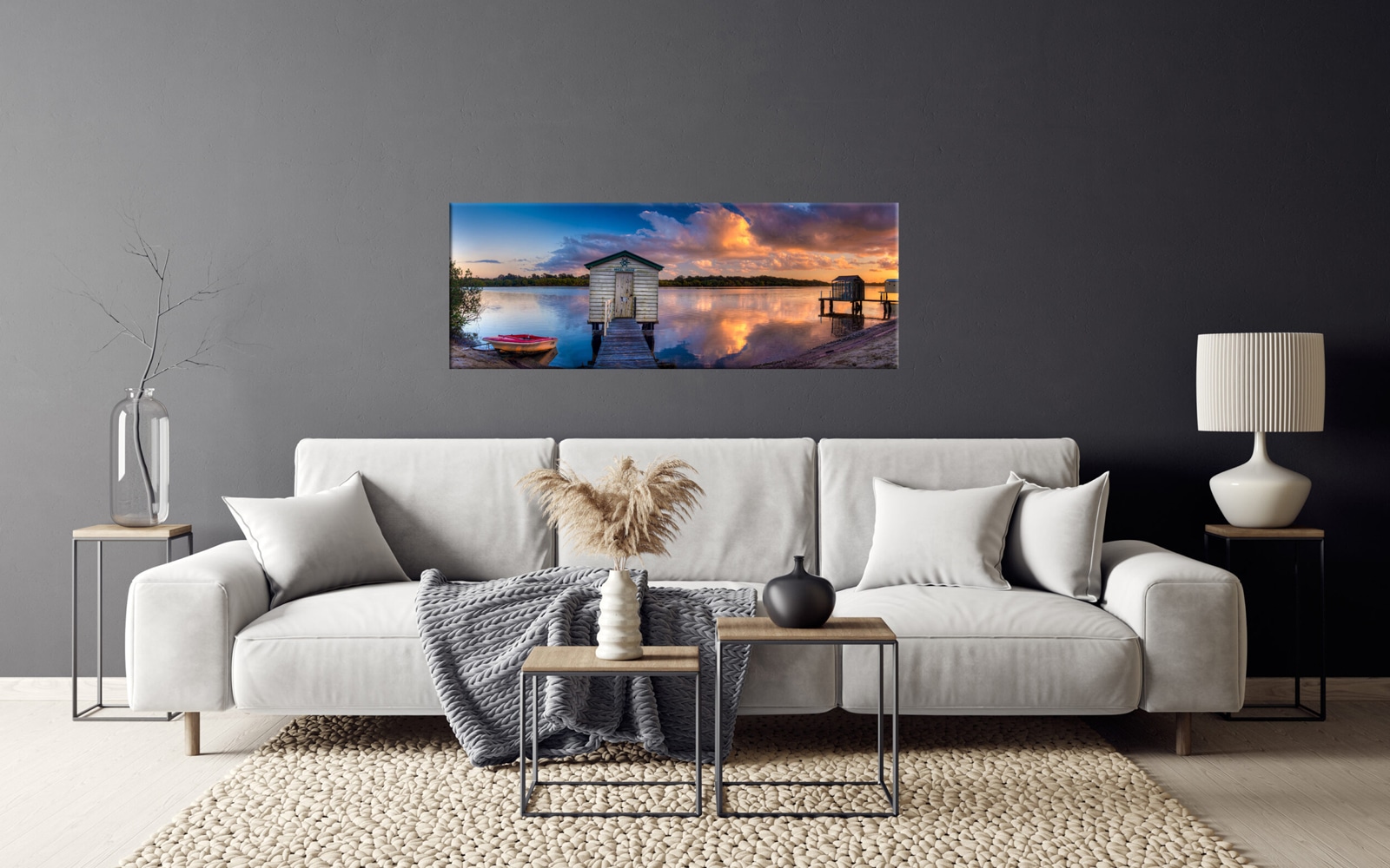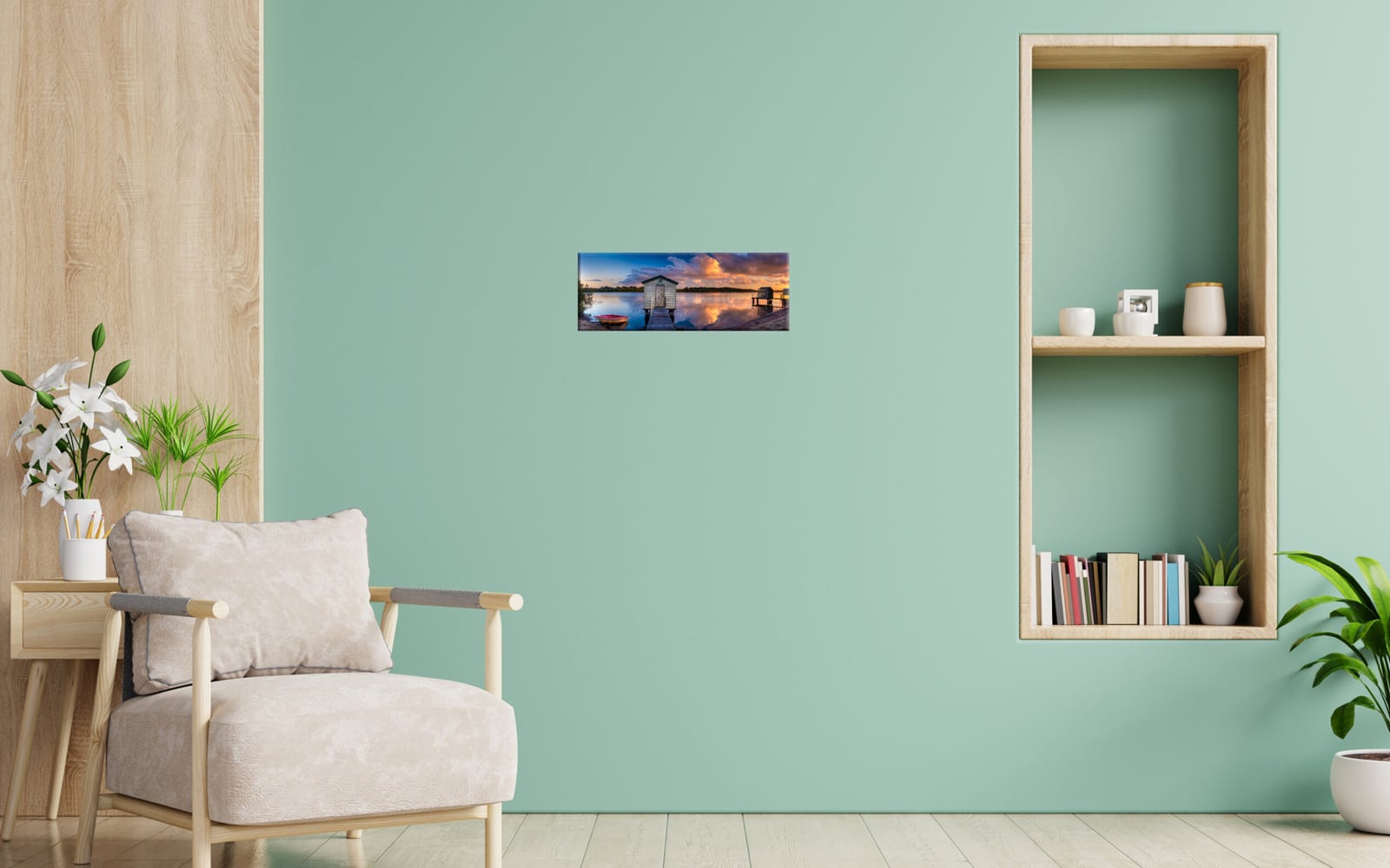 A panoramic art print of a serene lake scene at sunset, featuring a wooden boat dock with a small boat, calm water reflecting the colorful sky, and a quaint boat house at the end of the pier.
