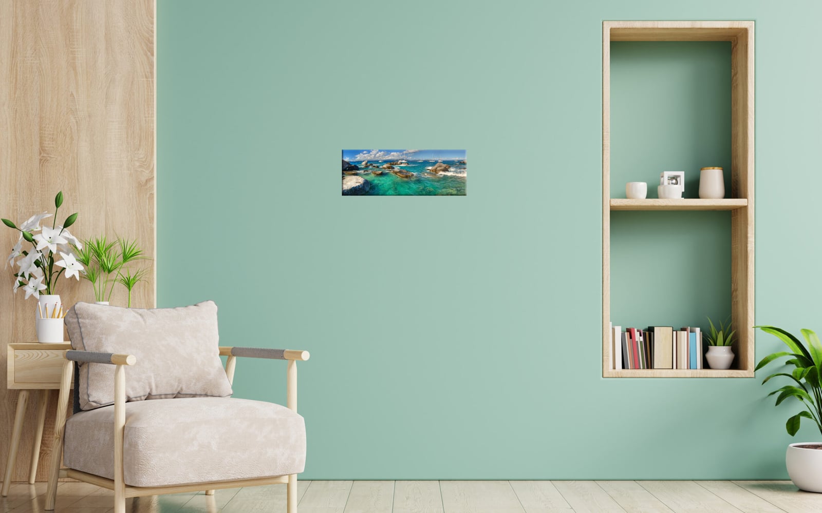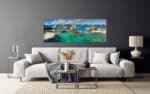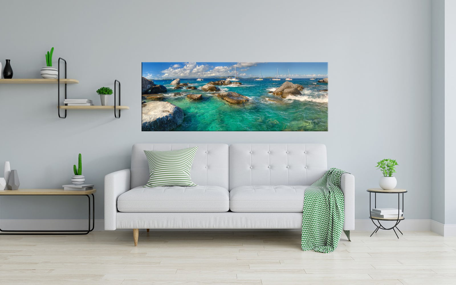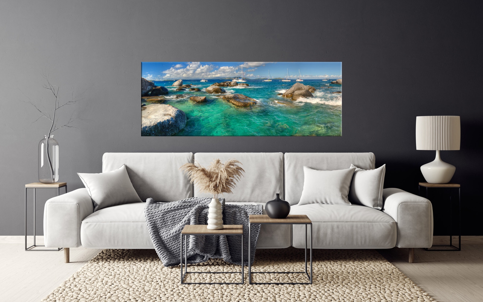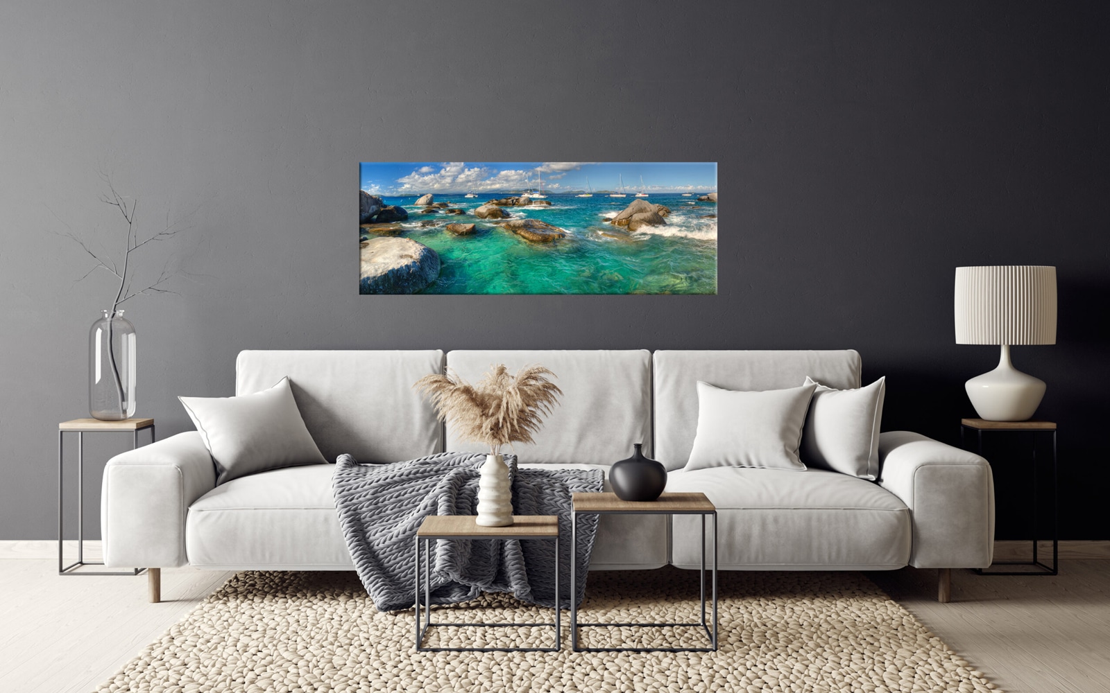 A panoramic canvas print depicting a vibrant turquoise sea with boulders, sailing yachts in the distance, and a clear blue sky.