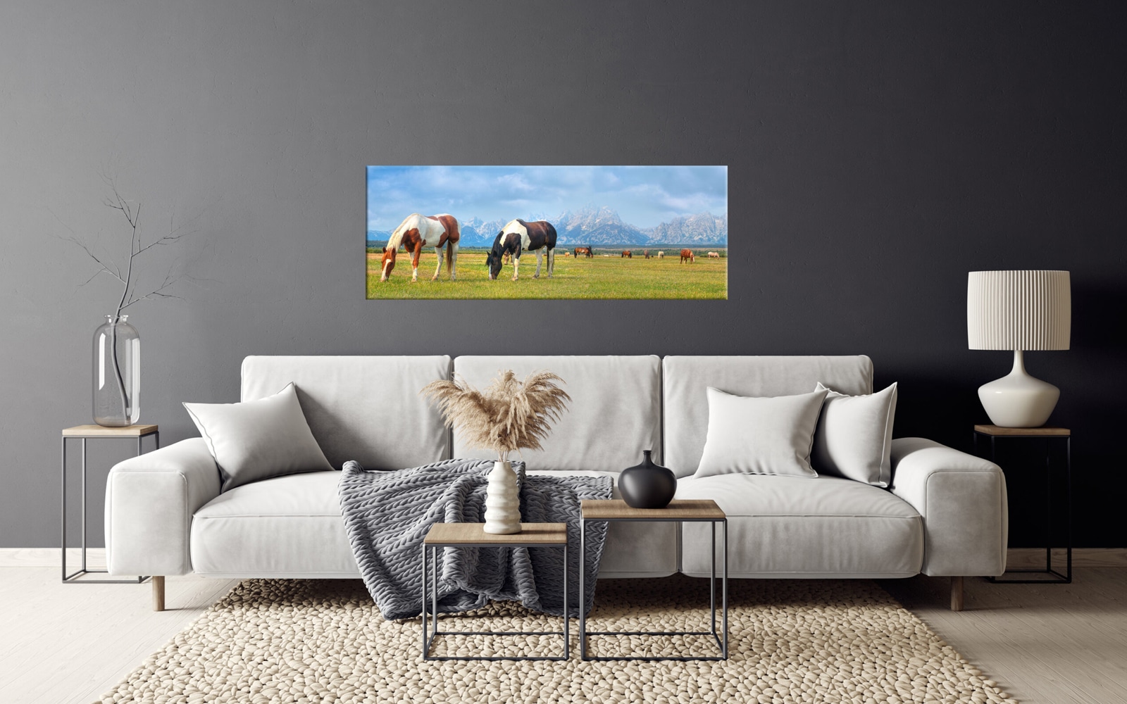 A painting of grazing horses in a field with majestic mountains in the background.